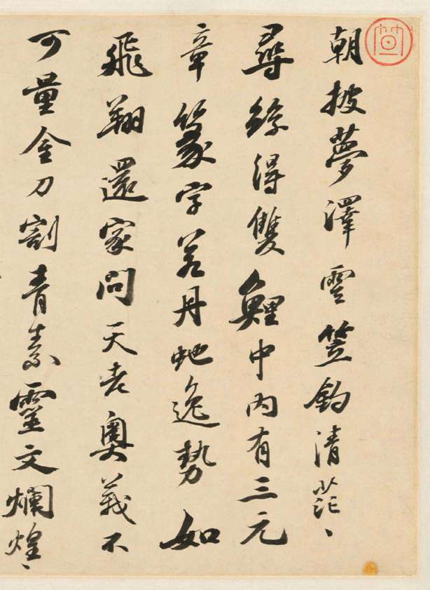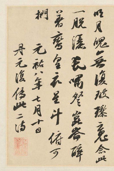二诗不见于李白诗集,苏轼在款题中称系友人丹元子姚安世所传,也有后人疑为苏轼自作。苏书原件于民国年间流入日本,现藏于日本大阪市立美术馆,是与《寒食帖》齐名的苏书杰作。笪重光的此件临作清越雄畅,虽与原作在细节上有所不同,但整体风格气韵相近,是一件遗貌取神的临书佳作。